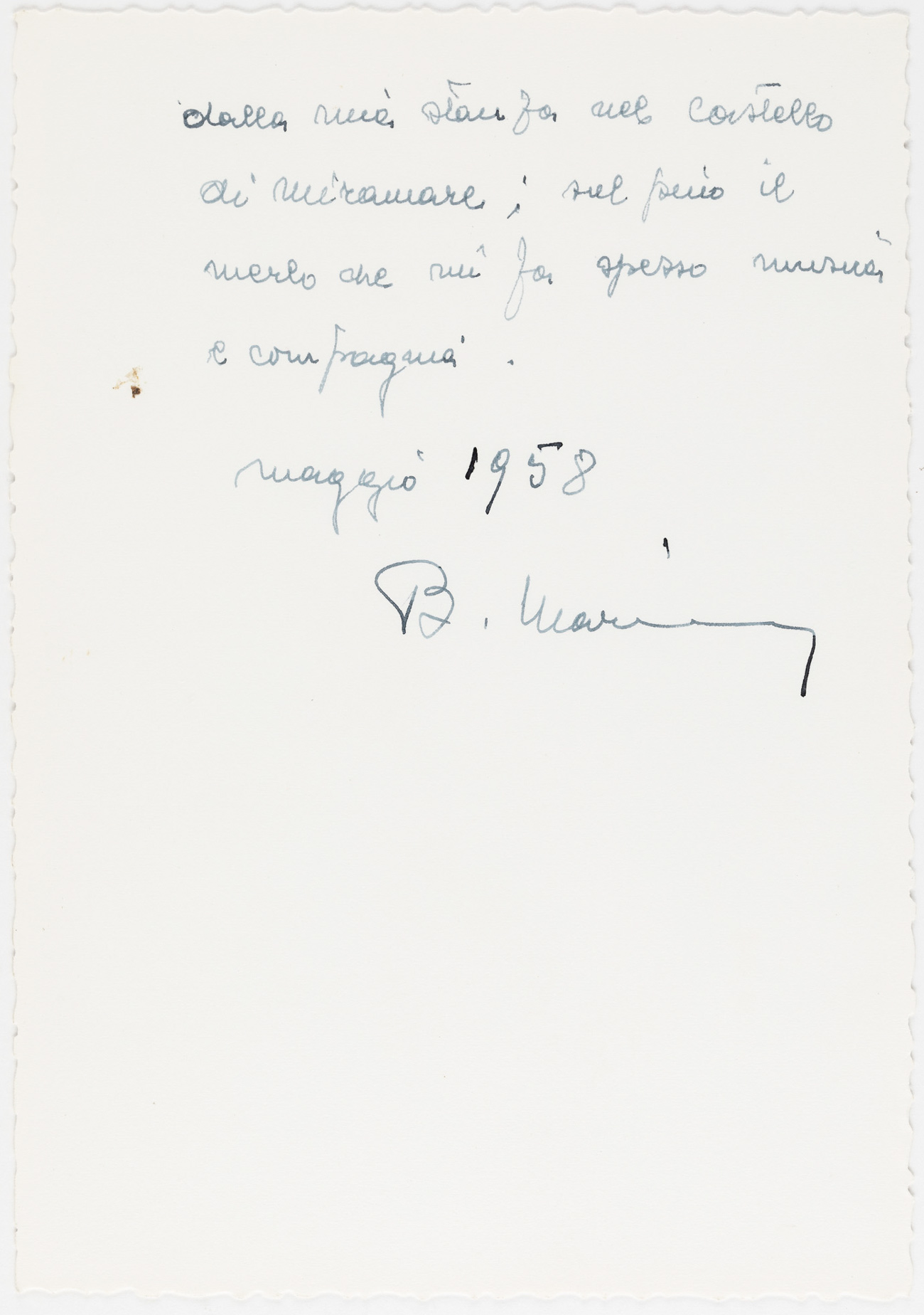 Con questo incarico sono stati messi in sicurezza 6000 fototipi. La catalogazione di un primo lotto di 2000 esemplari ha consentito di realizzare una nuova mappatura semantica coerente ed efficace e di costruire nuovi percorsi di valorizzazione per gruppi omogenei di schede. Il fine ultimo dell’intero progetto sarà quello di costruire percorsi di valorizzazione e conoscenza dell’intera vicenda umana di Biagio Marin, includendo anche lo sguardo speciale della sua raccolta fotografica. Ci si potrà immergere nel suo universo familiare e intimo, e al tempo stesso esplorare i paesaggi e i territori di Grado e della sua laguna, elementi centrali della sua vita e fonte d’ispirazione per la sua opera letteraria.
